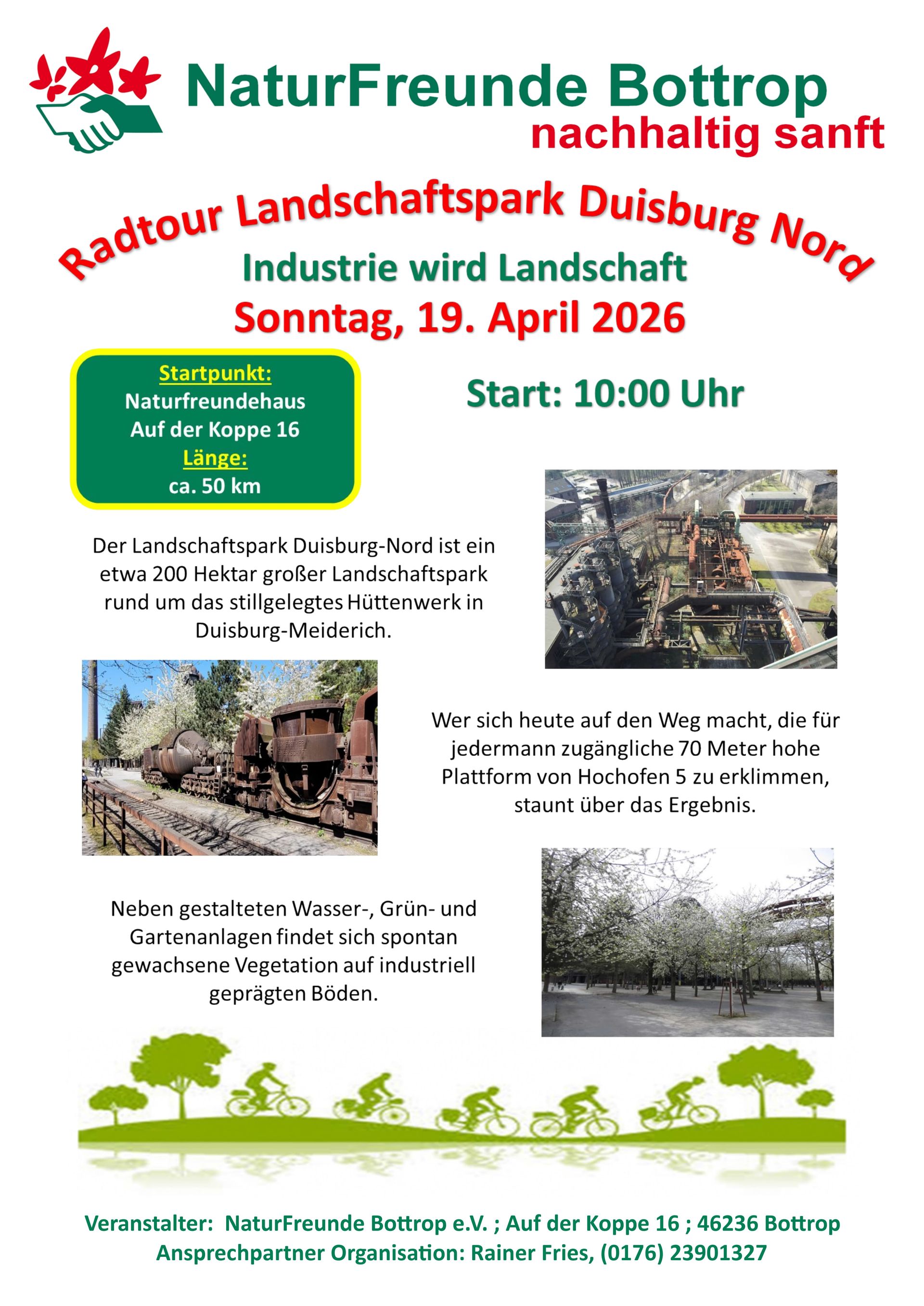 Bei Bedarf kehren wir nach den Touren im Naturfreundehaus Bottrop, Auf der Koppe 16 ein, um den Tag mit einem gemütlichen Zusammensein bei Kaffee und Kuchen oder frischgebackenen Waffeln ausklingen zu lassen. Auskunft erteilt unser NaturFreund Rainer Fries, (0176) 23901327.